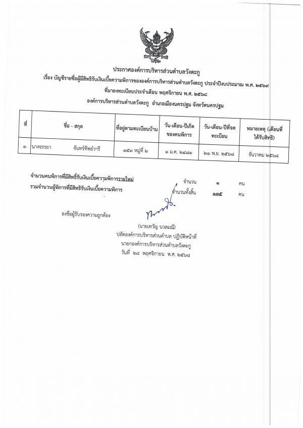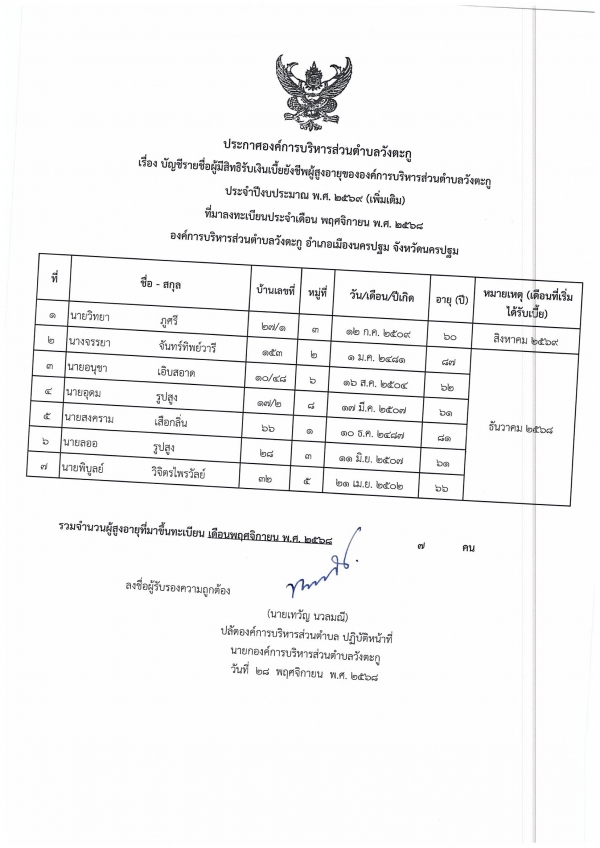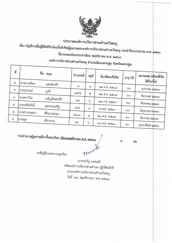 ประกาศรายชื่อผู้มีสิทธิรับเงินเบี้ยยังชีพผู้สูงอายุ และเบี้ยความพิการ ที่มาขึ้นทะเบียน เดือนพฤศจิกายน2568
