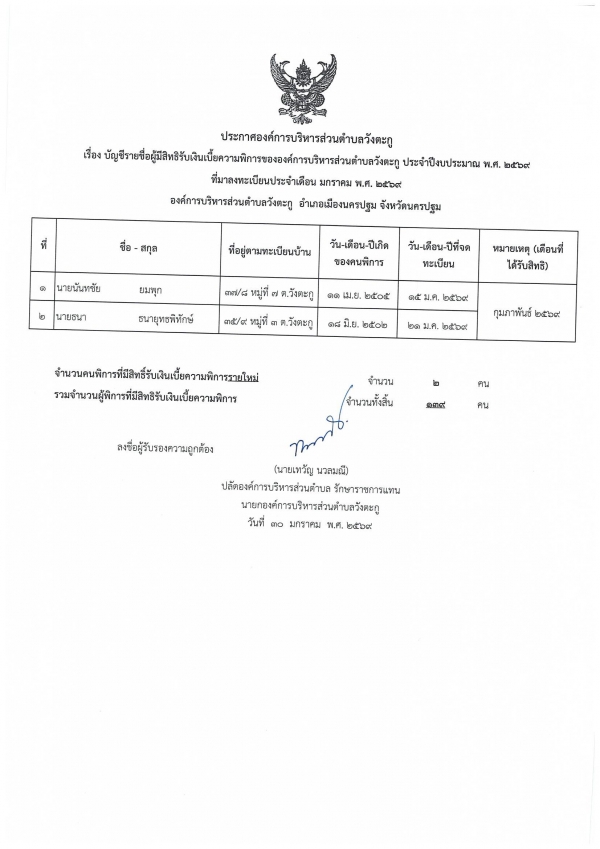 2. ประกาศ อบต.วังตะกู เรื่อง รายชื่อผู้มีสิทธิรับเบี้ยความพิการ ปีงบประมาณ พ.ศ. 2569 ที่มาขึ้นทะเบียน ในเดือนมกราคม 2569 จำนวน 2 ราย