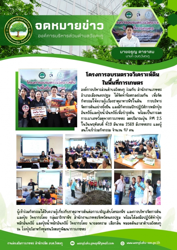 นายจรูญ ดาราสม นายกองค์การบริหารส่วนตำบลวังตะกู เป็นประธานกล่าวเปิดโครงการอบรมตรวจวิเคราะห์ดินในพื้นที่การเกษตร ประจำปี พ.ศ. 2569 โดยความร่วมมือระหว่าง อบต.วังตะกู และสำนักงานเกษตรอำเภอเมืองนครปฐม ซึ่งมีการจัดกิจกรรม ดังนี้